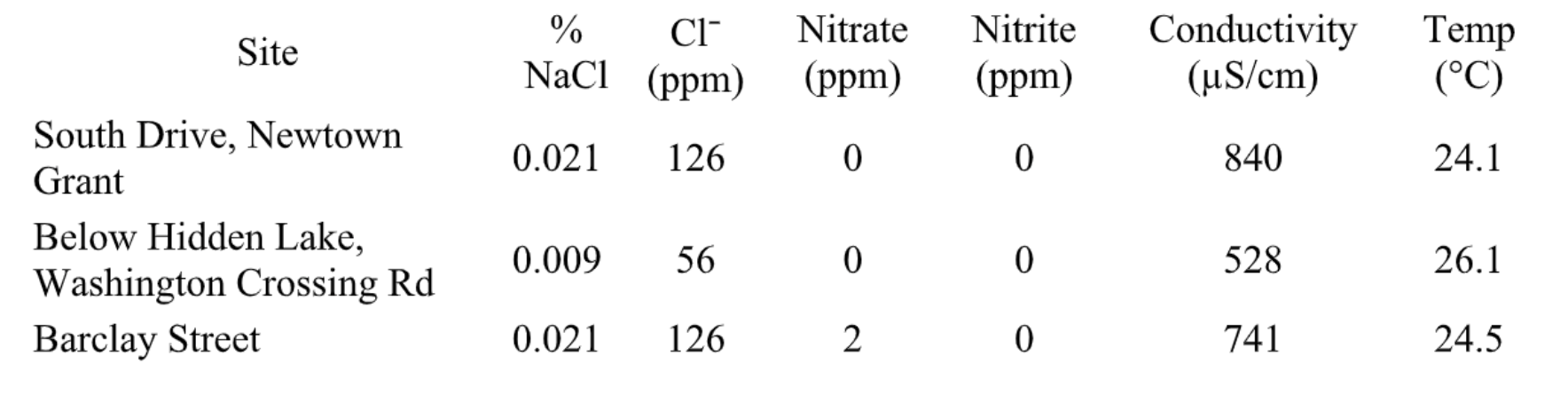 At all three sites, nitrite was not detected, and nitrate was only present at the most downstream site (Barclay Street). Chloride and NaCl were detected at all locations. Electrical conductivity readings were consistent with values previously reported in the watershed. The observed chloride (1 2 3) and electrical conductivity (4) data indicate stressful/harmful conditions for biota, especially sensitive taxa.